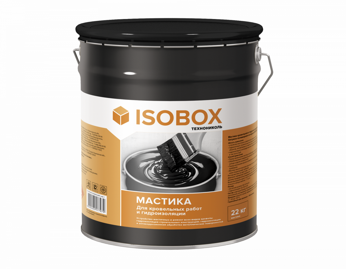 Мастика кровельная ISOBOX представляет собой готовый к применению материал, состоящий из нефтяного битума, модифицированного искусственным каучуком, технологических добавок, минеральных наполнителей и органического растворителя.