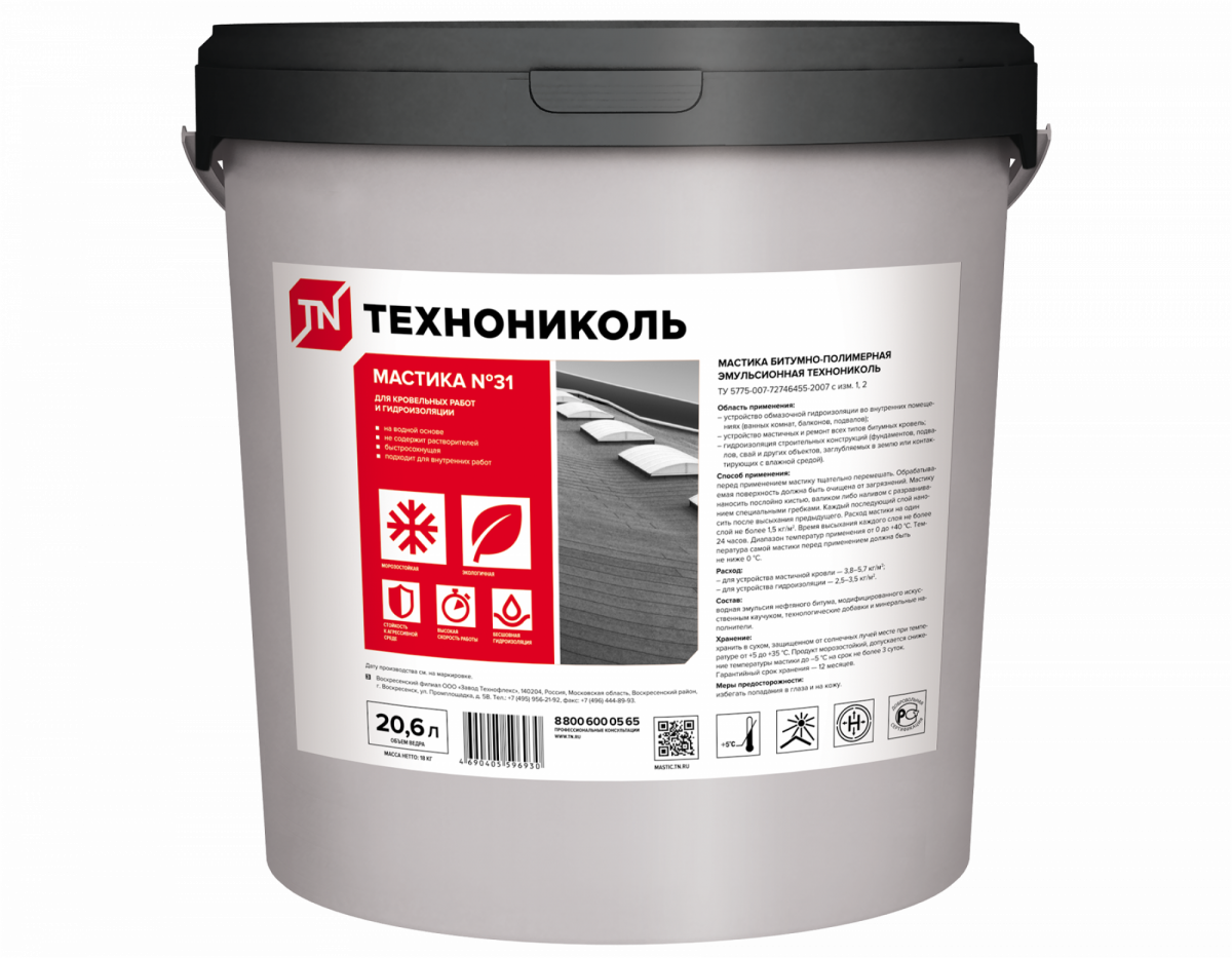 Мастика кровельная эмульсионная ТЕХНОНИКОЛЬ №31 морозостойкая - это готовый к применению материал, являющийся водной эмульсией нефтяного битума, модифицированного искусственным каучуком, технологических добавок и минеральных наполнителей. Покрытия на её основе обладают высокими: эластичностью, прочностью сцепления с основанием, теплостойкостью, устойчивостью к воздействию влаги. Не содержит растворителей.