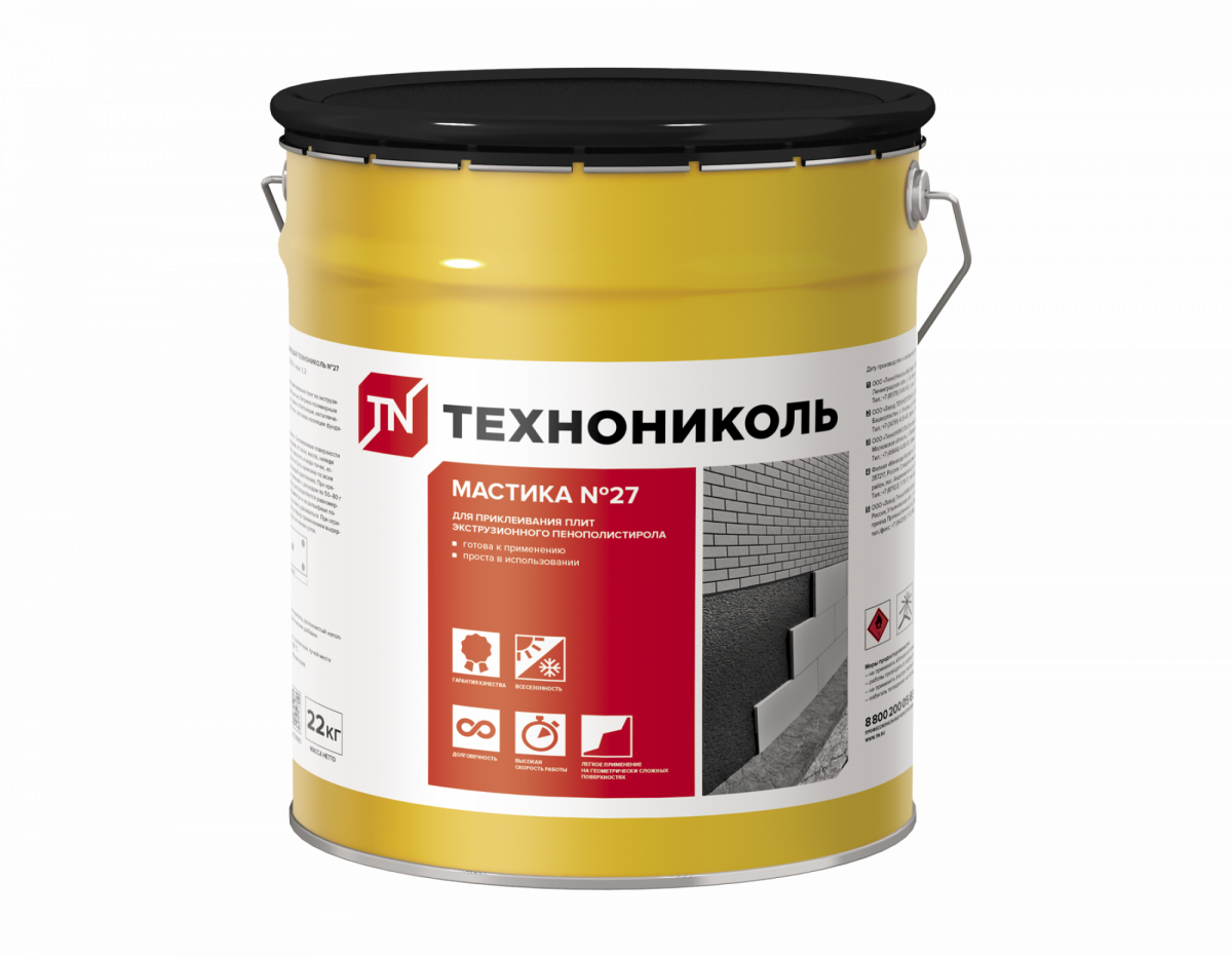 Мастика приклеивающая ТЕХНОНИКОЛЬ № 27 представляет собой многокомпонентную однородную массу, состоящую из битума, минерального волокна, минеральных наполнителей, растворителя и технологических добавок. Мастика приклеивающая ТЕХНОНИКОЛЬ № 27 предназначена для приклеивания плит из экструзионного пенополистирола к битумным, битумно-полимерным изоляционным материалам, а также к бетонным поверхностям в системах изоляции фундаментов.