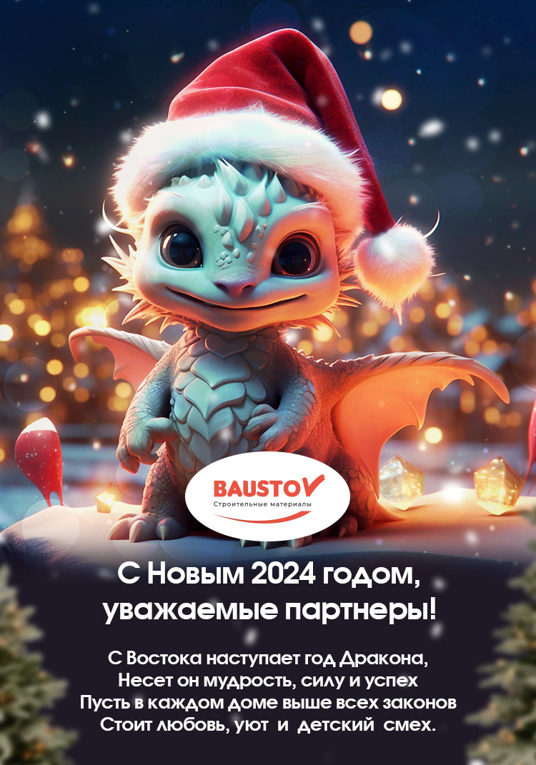 Компания "Баустов" рада поздравить вас с наступающим Новым 2024 годом! Мы благодарим вас за успешное и плодотворное сотрудниичество в уходящем году и надеемся на его продолжение в новом году.