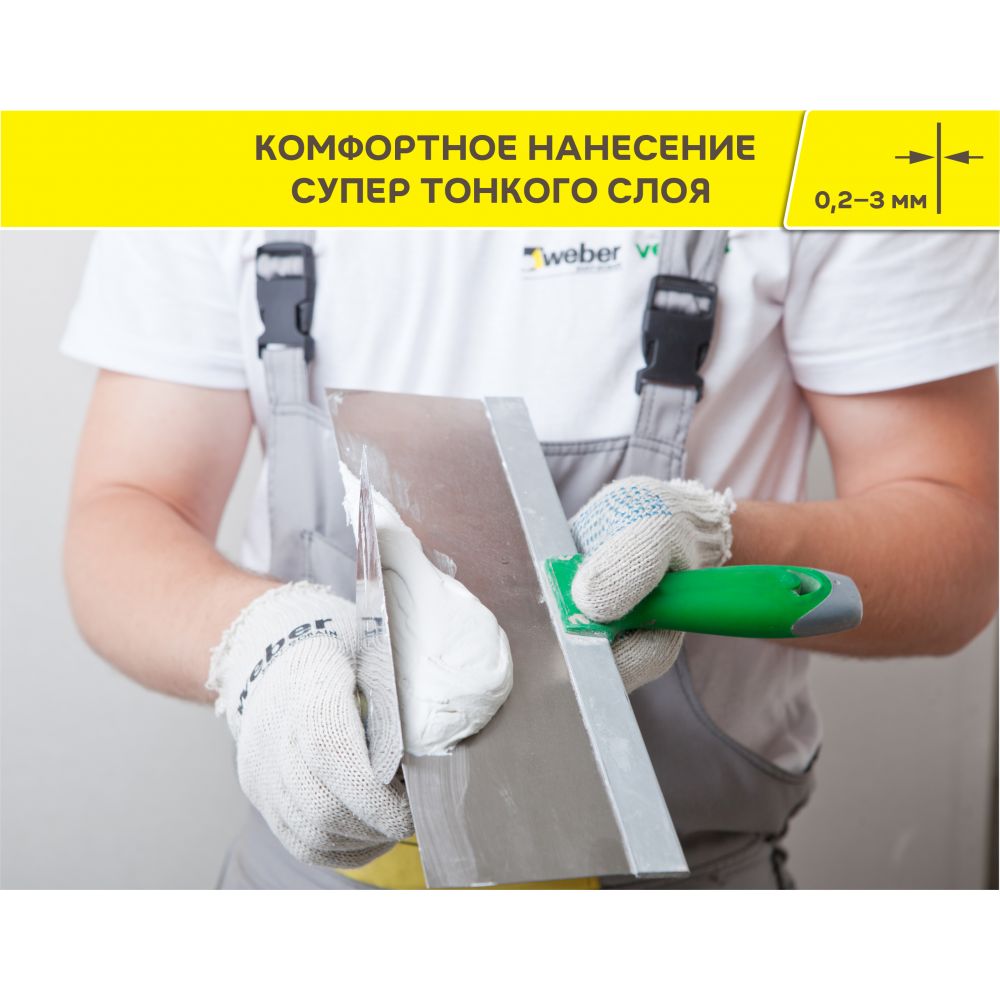weber.vetonit Fine - суперфинишная шпаклевка на полимерном связующем предназначена для экстра качественной подготовки стен под последующую окраску. Может применяться даже без слоя готовой шпаклевки поверх себя. Мельчайшая фракция зерна от 0.3 мм позволяет достигнуть супер тонкого слоя и равномерного распределения на обрабатываемой поверхности. После шлифовки приобретает зеркальную гладкость. Для внутренних работ в сухих помещениях.Важно знать