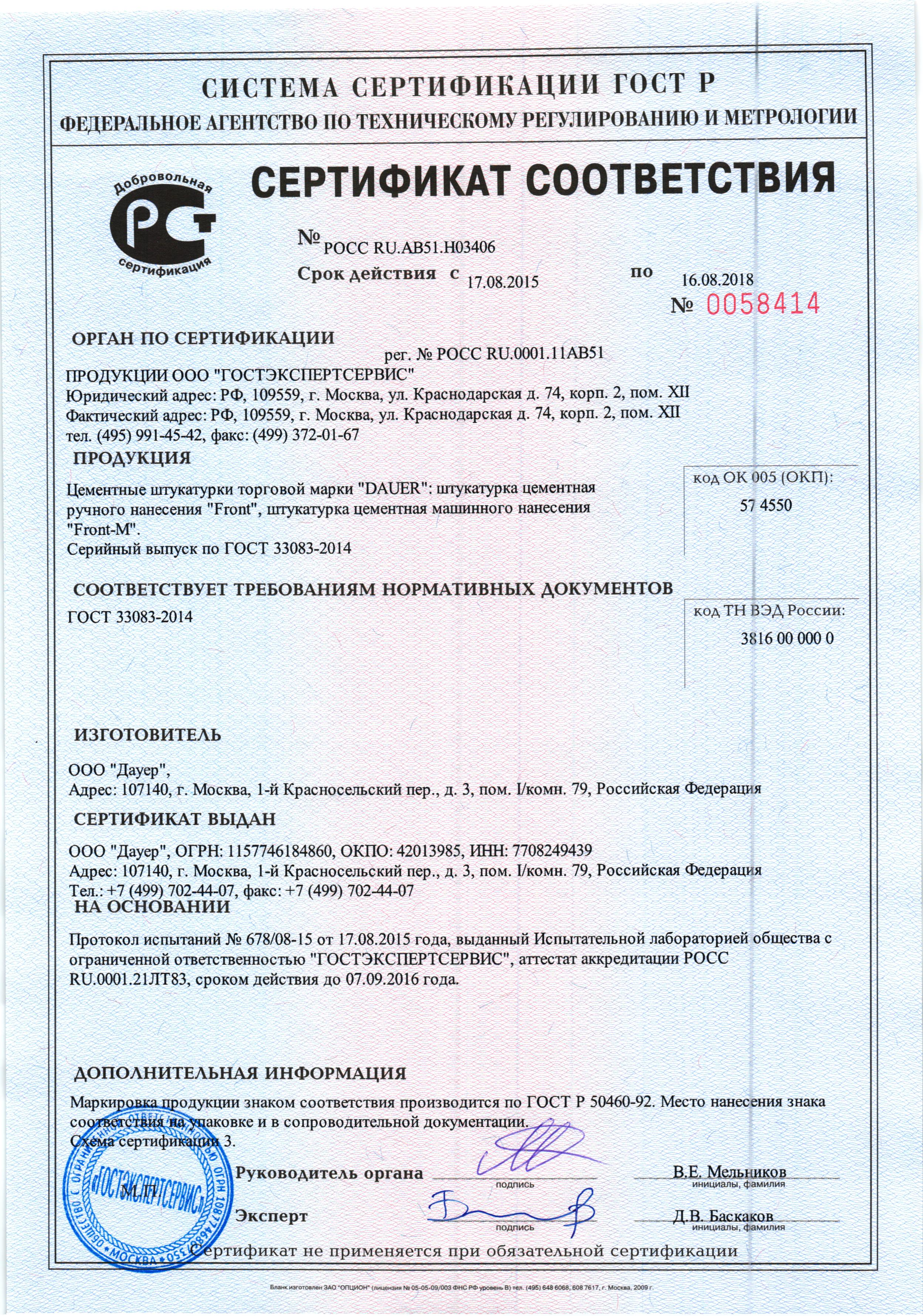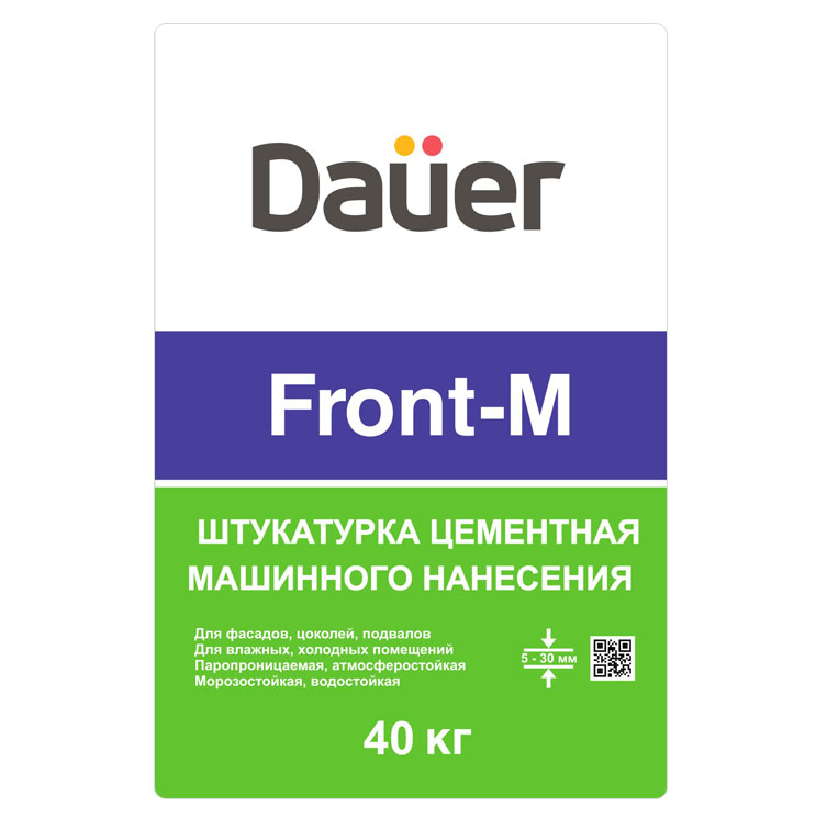 Штукатурка цементная машинного нанесения Daüer «FRONT-М / ФРОНТ-М» сухая смесь серого цвета в основе, которой высококачественный цемент. В качестве наполнителей в смесь введены минеральные добавки, а для армирования высохшего слоя полимерные волокна. Перед нанесением требуется затворение с водой в указанной производителем пропорции. Поставляется смесь, в расфасованном виде по 40 кг в мешки из многослойной бумаги.